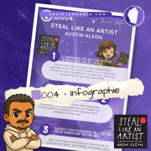 Description : Cette infographie prĂ©sente les cinq principes essentiels dâAustin Kleon pour dĂ©velopper votre crĂ©ativitĂ©. DĂ©couvrez comment puiser dans les influences, cultiver des routines, et partager votre travail pour exprimer une crĂ©ativitĂ© unique et authentique. En suivant ces Ă©tapes, vous apprendrez Ă "voler" des idĂ©es pour mieux les rĂ©inventer.